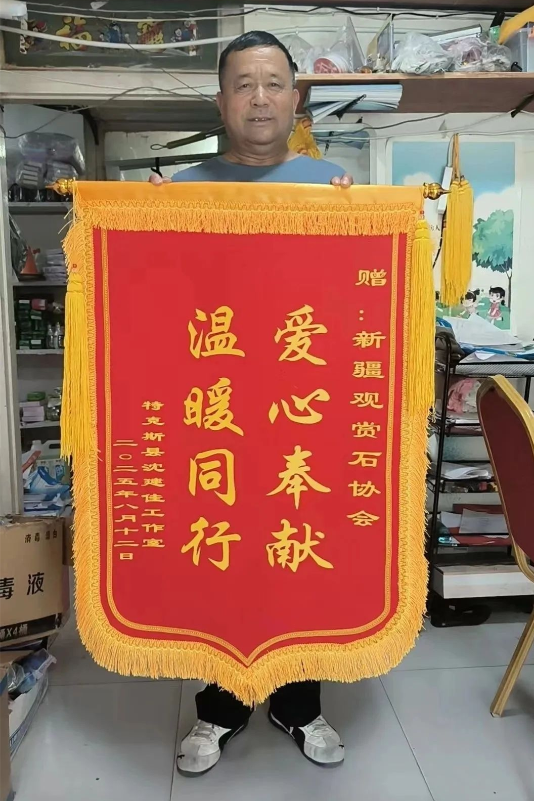 沈建佳也是特克斯县观赏石协会会员,他的先进事迹深深感染了新疆观赏石协会全体会员。协会于8月8日在乌鲁木齐举行珠宝奇石义捐义拍活动,拍卖结束,会长庞大山代表全体会员将拍卖所得17600元善款全部赠予“沈建佳工作室”。沈建佳代表工作室向新疆观赏石协会赠送写有“爱心奉献 温暖同行”的锦旗。