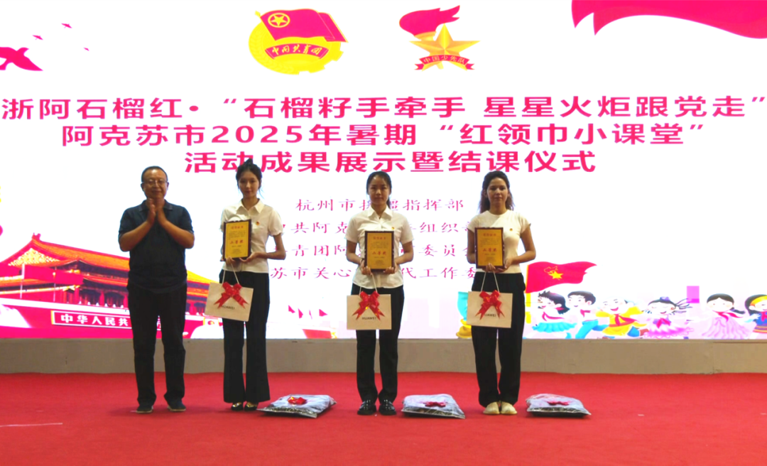 近日,由阿克苏市关工委、团市委联合主办的“浙阿石榴红·石榴籽手牵手·星星火炬跟党走”2025年暑期“红领巾小课堂”活动成果展示暨结课仪式隆重举行。地区关工委副主任木塔力甫·尼亚孜,市关工委主任刘卫江,市委常委、组织部部长、教育党工委书记孙立霞等领导参加活动。