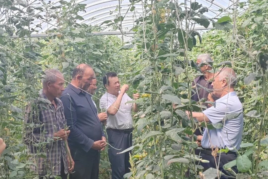 在阔洪其村,“五老”人员深入蔬菜大棚基地,实地查看各类蔬菜生长情况。他们仔细观察豇豆、西红柿、辣椒等主打蔬菜品种的生长状态,详细询问当前种植密度、水肥管理、病虫害防治等技术应用细节,并不时俯身观察作物叶片、果实长势,与种植户交流种植过程中的心得体会。“西红柿坐果率不错,但枝叶修剪还能再精细些,果实成熟会更均匀。”有着20年农业技术推广经验的阿布都热依木·亚生一边观察,一边向种植户讲解关键技术要点。