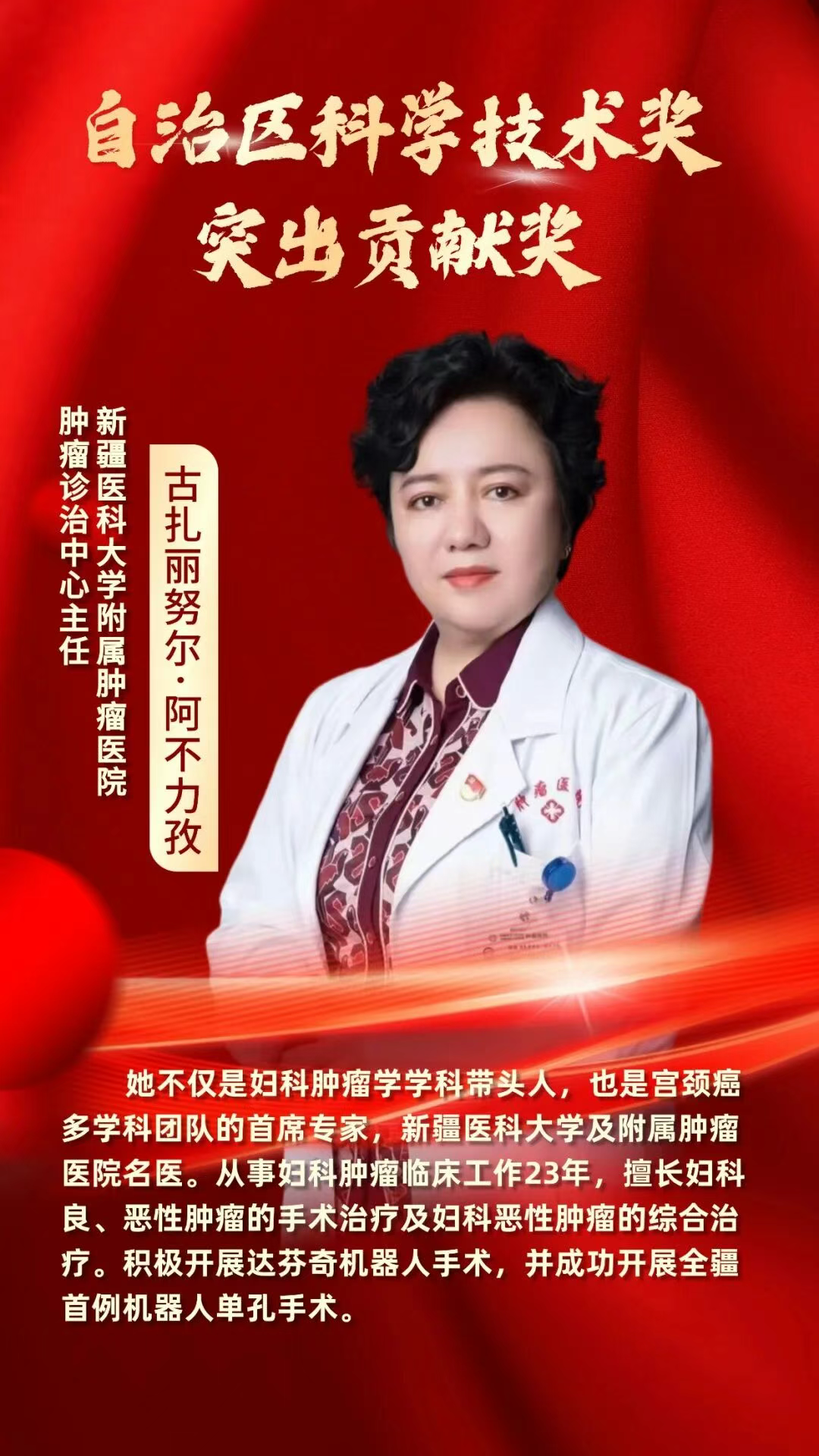 古扎丽努尔·阿不力孜,在妇科肿瘤诊治,特别是宫颈癌防治研究上成果丰硕,带领的课题组持续进行宫颈癌的系列研究,为新疆卫健委在宫颈癌中应用HPV检测方法的决策提供了科学证据,惠及了50余万例妇女,显著提升了新疆的医疗技术水平与服务能力。
