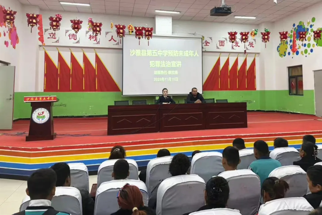 近日,沙雅县关工委联合县第五中学开展“预防未成年人犯罪”专题法治宣讲,600多名学生及家长共同参与这场法治“必修课”。