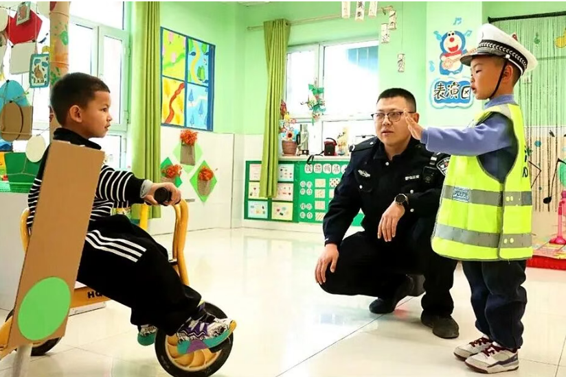 结合幼儿园孩子的认知特点,民警们把交通规则学习变成角色扮演游戏,用彩色胶带贴成一条“微型马路”,由孩子们扮演“小交警”“小司机”等角色。在交警叔叔的指令下,孩子们在欢声笑语中将“红灯停、绿灯行”的规则牢记于心。