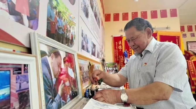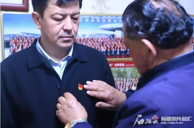 升旗前,沙勒克江老人为儿子佩戴党员徽章。(图片来源:石榴云)